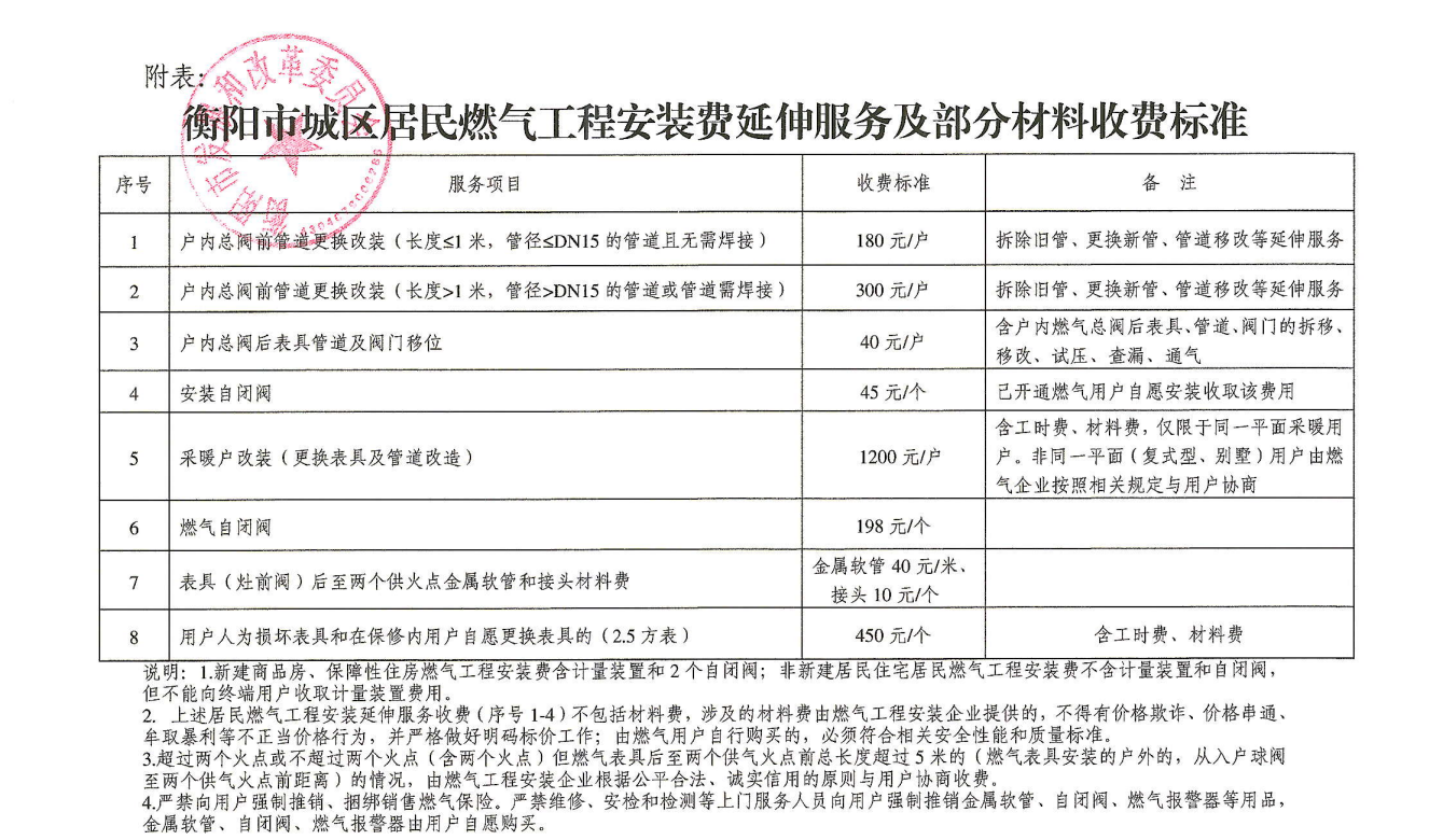 根據(jù)衡陽市發(fā)展和改革委員會《關于規(guī)范市中心城區(qū)燃氣工程安裝收費有關事項的通知》(衡發(fā)改價商〔2024〕2號)文件規(guī)定: