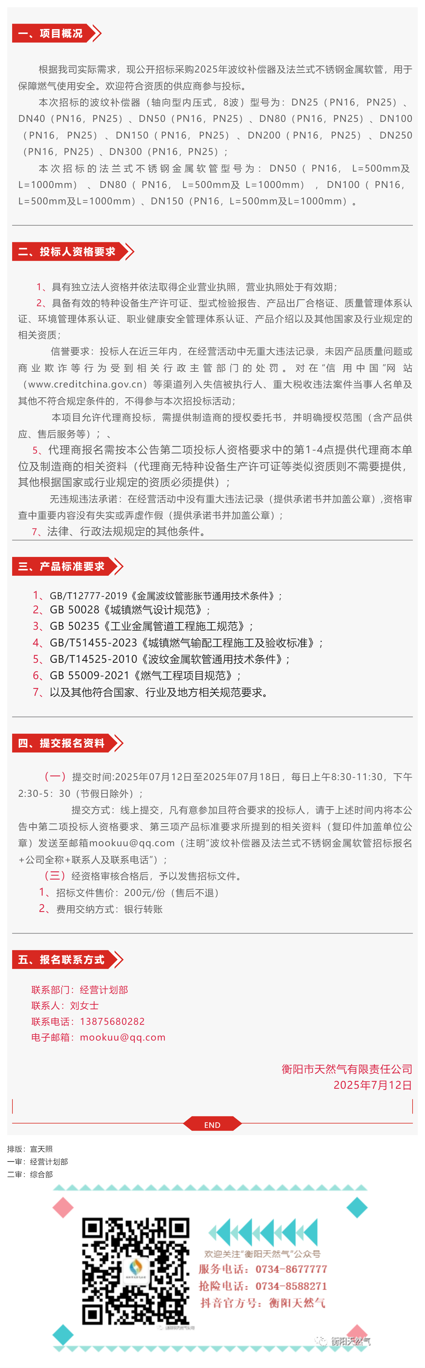 招標公告丨衡陽市天然氣有限責任公司2025年波紋補償器及法蘭式不銹鋼金屬軟管采購招標公告