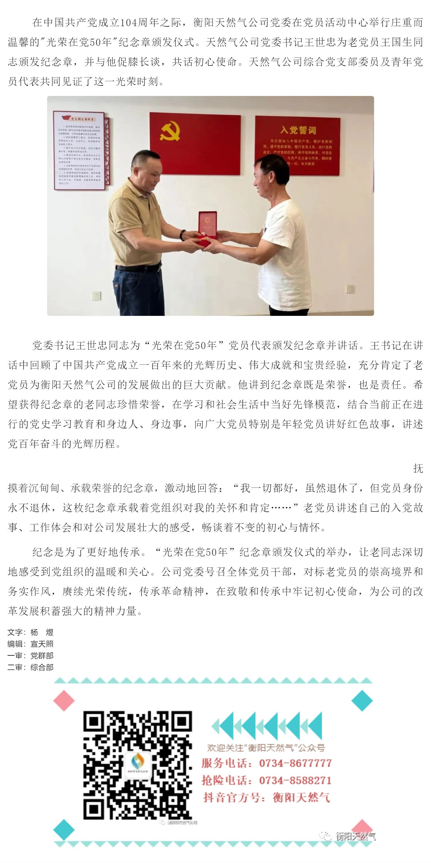 賡續(xù)紅色血脈+永葆黨員本色天然氣公司黨委舉行光榮在黨50年紀念章頒發(fā)儀式